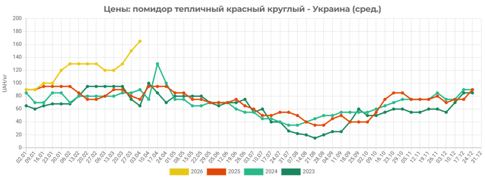 При этом основное предложение на украинском рынке по‑прежнему формируют импортные овощи из Турции. По словам участников рынка, турецкие томаты стоят несколько дешевле местных. Цены на импортную продукцию озвучиваются в диапазоне 130–150 грн/кг ($2,97–3,43/кг) в зависимости от качества и объёмов партий.