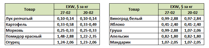 В Украине на фоне растущего спроса начал дорожать картофель. Дороже, чем неделей ранее, продавались морковь и столовая свекла. В то же время цены на белокочанную капусту снизились. Рост предложения огурца из местных тепличных комбинатов, пусть и не существенный, вынудил продавцов снизить цены. Также начал дешеветь помидор. Цены пекинскую капусту выросли, а зеленый лук и салат подешевели. Во фруктово-ягодном сегменте снижением цены отметилась земляника садовая.