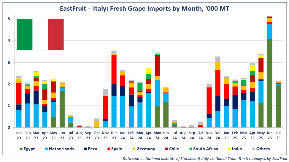 Italy’s imports of fresh grapes have been rising for three consecutive seasons. In the first seven months of 2025, imports grew by 34% compared to the same period in 2024. The Netherlands and Spain remain Italy’s top suppliers, together covering more than half of the country’s grape imports. Egypt, Peru, and Germany round out the top five.