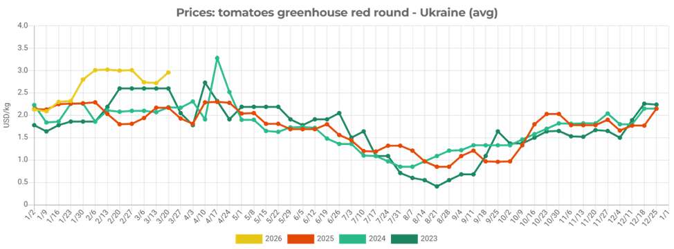 It is also noted that tomato prices in Ukraine are now on average 89% higher than during the same period last year. Market participants do not rule out further price increases if tomato supplies from Turkey to Ukraine do not stabilize in the near future. It is also important to note that sales of domestically grown greenhouse tomatoes will not begin before mid‑April of this year.