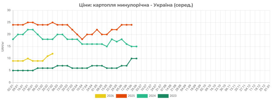 У порівнянні з минулим сезоном сьогодні картопля в Україні надходить у продаж у середньому на 55% дешевше, ніж у останні дні лютого 2025 року. Водночас більшість фермерів планують і надалі підвищувати ціни, посилаючись на стрімке скорочення запасів картоплі у сховищах.